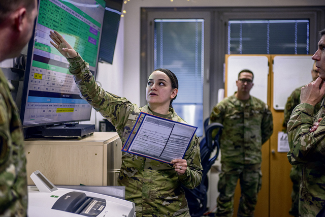 U.S. Air Force Airman 1st Class Selina Frye, 721st Mission Support Squadron Air Mobility Control Center junior controller, briefs Maj. Gen. John Klein, U.S. Air Force Expeditionary Center commander, and Chief Master Sgt. Courtney Freeman, USAFEC command chief, about the 721st MSS mission and control center. The AMCC acts as a control element in the 521st Air Mobility Operations Wing and provides information to the 618th Air Operations Center, located at Scott Air Force Base, Illinois, and incoming and outgoing aircrew and ground support. (U.S. Air Force photo by Airman 1st Class Madelyn Keech)