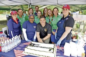 U.S. Army Garrison Rheinland-Pfalz Commander Col. Jason T. Edwards (center) takes part in a cake cutting to celebrate the Army’s 244th Birthday along with USO Kaiserslautern and garrison Family and MWR team members at the Community Expo June 14 at Pulaski Park, Kaiserslautern. The expo provided community members an opportunity to meet representatives from local agencies, win prizes and enjoy birthday festivities such as cake, refreshments and a Zumba fitness demonstration.
