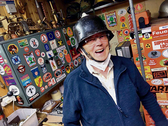 92-year-old Horst Teumer laughs as he shows off the original firefighting helmet he wore when he joined the Baumholder Military Community Fire Department in 1954. Teumer eventually became the Fire Chief on the Baumholder installation and retired in 1994. Photo by Keith Pannell