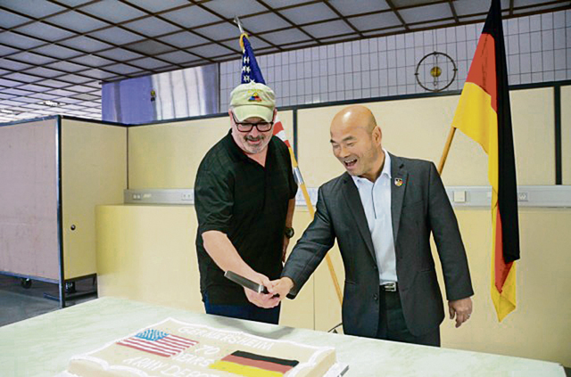 Germersheim Army Depot Site Manager Leonard Chanler, left, and Deputy Garrison Manager Jae Kim, right, prepare to cut the cake celebrating 70 years of Army operations at Germersheim Army Depot. Photo by Nicole Alberico