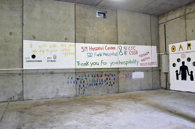 A mural thanking Operation Allies Welcome mission partners at living support area four was painted on the wall of the travelers’ living quarters on Rhine Ordnance Barracks. Photo by Shaylee Borcsani