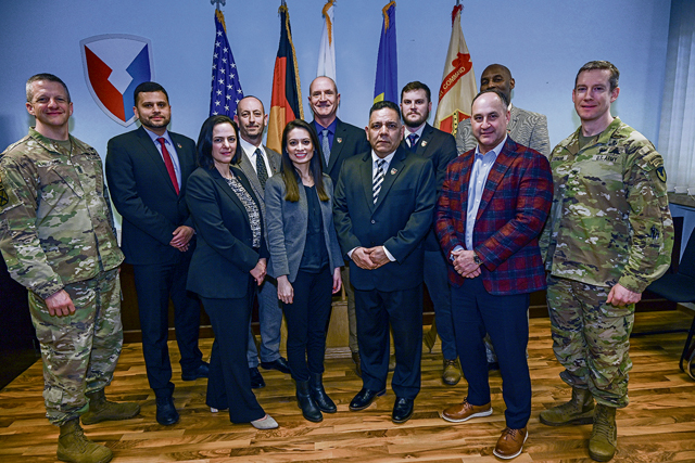 Pictured from left to right: USAG Rheinland-Pfalz Command Sgt. Maj. Stephen LaRocque; Michael Hawthorne, Antiterrorism Officer and recipient of the Lieutenant Colonel Ronald C. Francis Best Antiterrorism Program Manager Award; Nicole Alberico, Public Affairs Specialist and FY22 HQDA Antiterrorism Honor Roll Honoree; Michael Schack, Emergency Management Specialist and FY22 HQDA Antiterrorism Honor Roll Honoree; Mary Del Rosario, Public Affairs Specialist and FY22 HQDA Antiterrorism Honor Roll Honoree; Tom Leugers, Chief, Protection, Directorate of Plans, Training, Mobilization and Security; Daniel Lopez, Antiterrorism Officer and FY22 HQDA Antiterrorism Honor Roll Honoree; Robert Taylor, Emergency Management Specialist and FY22 HQDA Antiterrorism Honor Roll Honoree; Paul Hossenlopp, Deputy Garrison Commander; Dennis Mathis, Security Specialist; Col. Reid Furman, USAG Rheinland-Pfalz Commander.