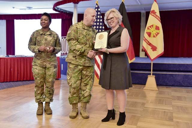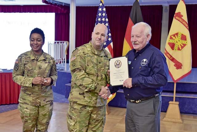The garrison conducts quarterly length-of-service ceremonies in Kaiserslautern and Baumholder communities. Kenneth Armstrong, directorate of human resources and event organizer, explained the ceremonies allow the garrison to formally acknowledge its employees, both civil service and local national.