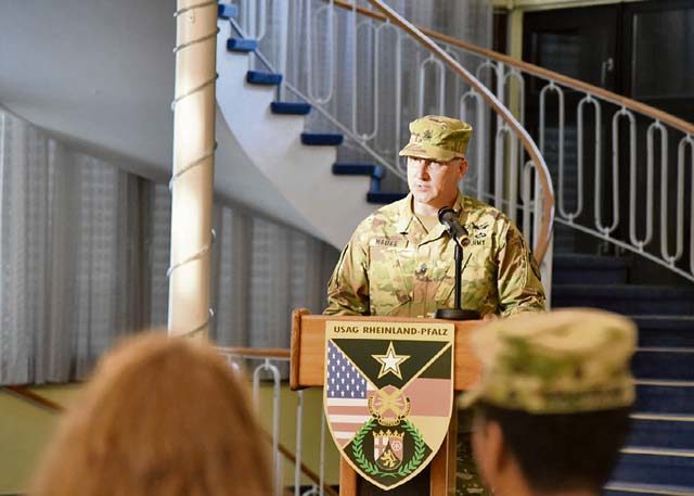 U.S. Army Garrison Rheinland-Pfalz welcomed a new command sergeant major during an assumption of responsibility ceremony, Sept. 26, who will provide support and oversight of 29 installations with more than 50,000 Soldiers, government civilian employees and their families.