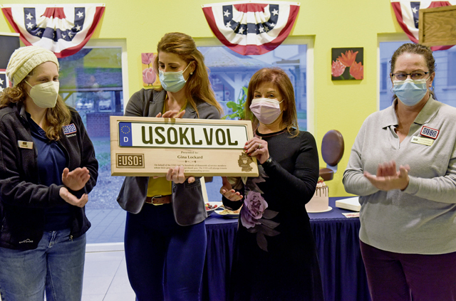 Geno Mendiola, United Service Organizations Warrior Center operations manager, recognizes Gina Lockard, USO volunteer, during a ceremony at Landstuhl Regional Medical Center, Jan. 5. Lockard contributed more than 1,000 hours in volunteer work at the USO. During the Afghan evacuation operation, the USO provided support in the Joint Mobility Processing Center processing and distributing donations. The USO strengthens America’s military service members by keeping them connected to family, home and country, throughout their service to the nation.