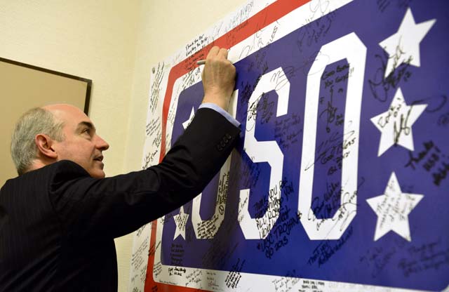 Photo by Senior Airman Hailey Haux Dr. J.D. Crouch, USO president and CEO, endorses the USO banner after taking a tour of the Contingency Aeromedical Staging Facility Oct. 28 on Ramstein. Crouch and his wife, Kristin, came to Ramstein to visit different USOs in the region.
