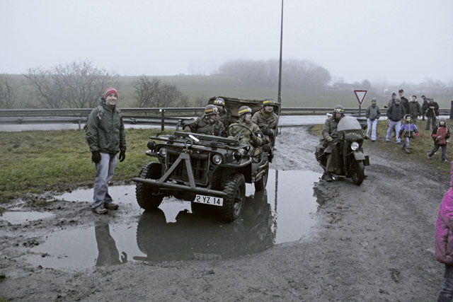 Matthew Hartnett stands next to a replica of a military police vehicle on patrol during the 69th annual 22K Bastogne Historic Walk.