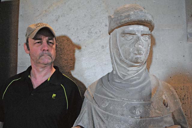 Bill Smith poses for a photo with a statue at the Chateau de Pierrefonds April 12 in France.