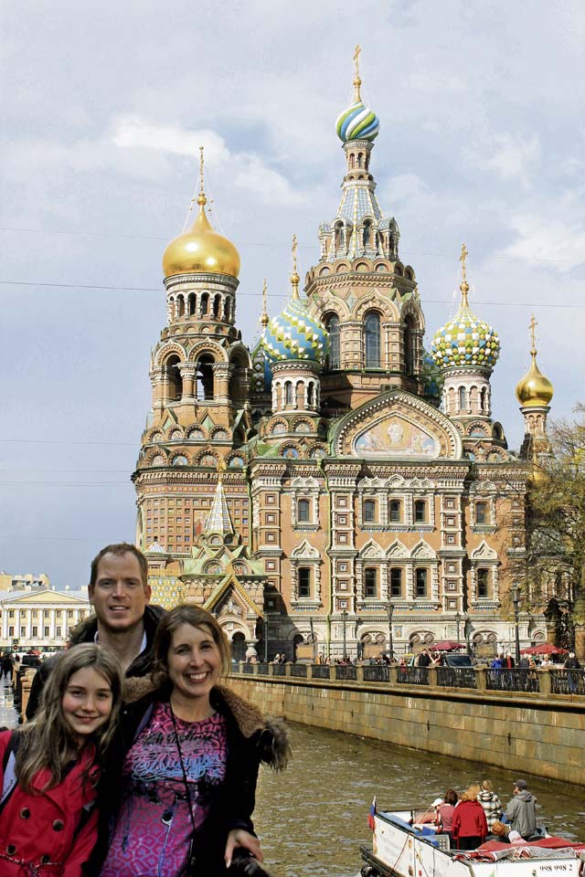 Trenton Hamson, Haley Miracle (left) and Rebecca Hamson pose for a photo May 10 at the Church of the Savior on Spilled Blood in St. Petersburg, Russia.