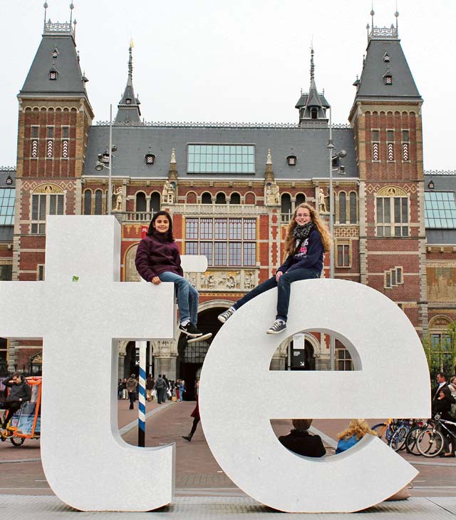 Best friends Eliana Vales and Trinity Whitesides sit on the Amsterdam letters outside the Rijksmuseum during a spring break trip to Amsterdam in the Netherlands.