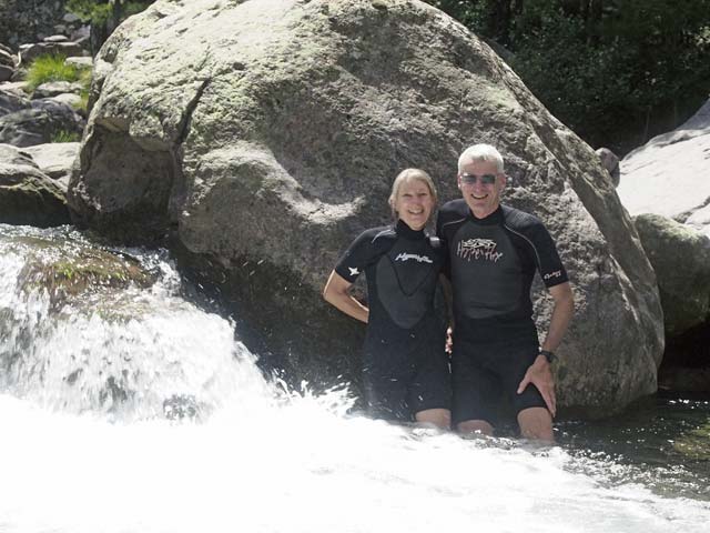 Elaine and Dennis Edwards pose for a photo while canyoning June 28 in the Gorge d’Asco in Corsica, France.