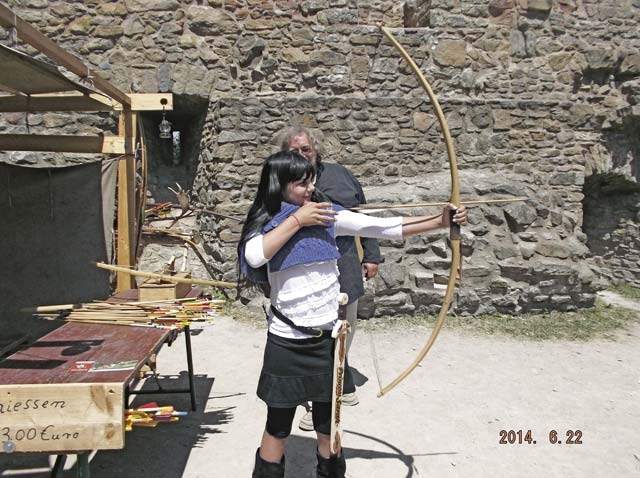 Sarah Dudjak tries her hand at archery at a medieval fest June 22 at Burg Lichtenberg in Kusel.