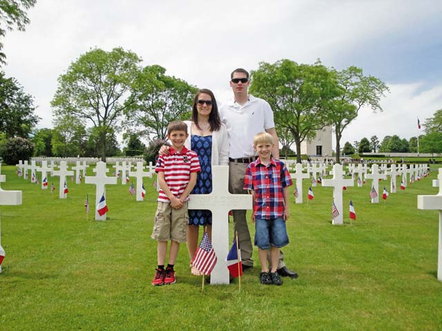 Tiffany, Brandon, Nicolas and Jordon Allen pose for a photo at the grave of Charles E. Morecraft May 26 at the Lorraine American Cemetery and Memorial in France. Morecraft was Tiffany Allen’s great-great-uncle who died April 18, 1945, in World War II.