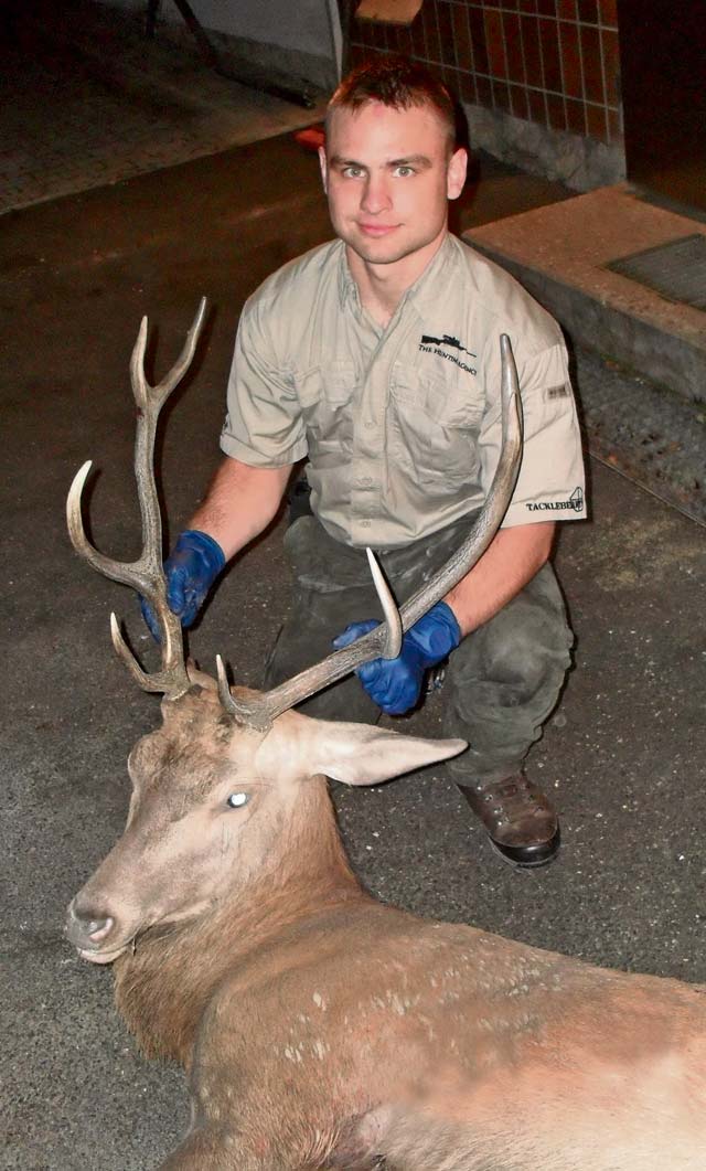 Joshua Nicholson poses for a photo with a bull red stag during a hunting vacation Sept. 3 to Grafenwöhr, Germany. Nicholson has a German hunting license obtained through the Rod and Gun Club, which allows him to hunt and own firearms in Germany.
