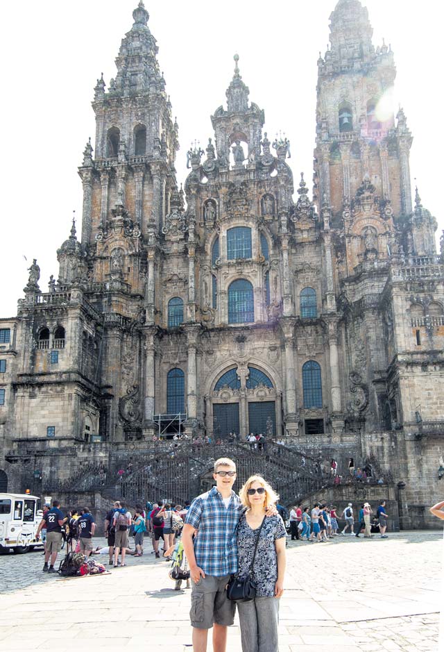 - Courtesy photo Alexander and Britta Burke pose for a photo in July in front of the Santiago de Compostela Cathedral in Spain.