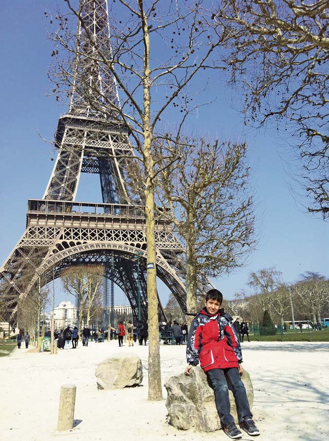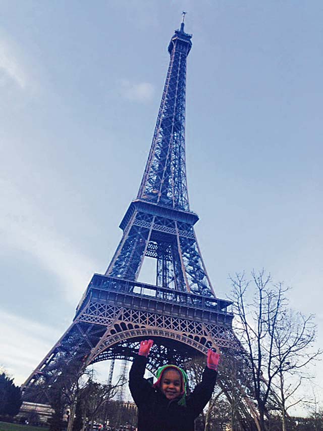 Jennaya Carruthers, 4, poses for a photo at the Eiffel Tower Jan. 19 in Paris.