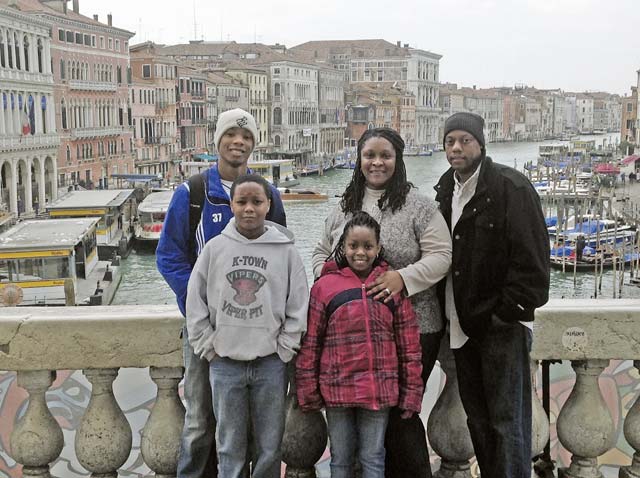 From left, Malik, Marquise, Mariah, Ursela and Phillip Jackson pose for a photo Feb. 16 on the Rialto Bridge in Venice, Italy.