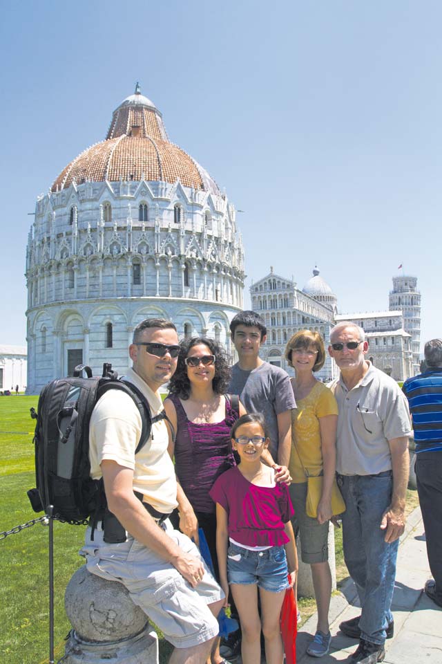 Donald, Susanne, Donald Jr., Jade, Cathy and Steven Fisher pose for a photo in front of the Piazza del Duomo and the Leaning Tower in Pisa, Italy.