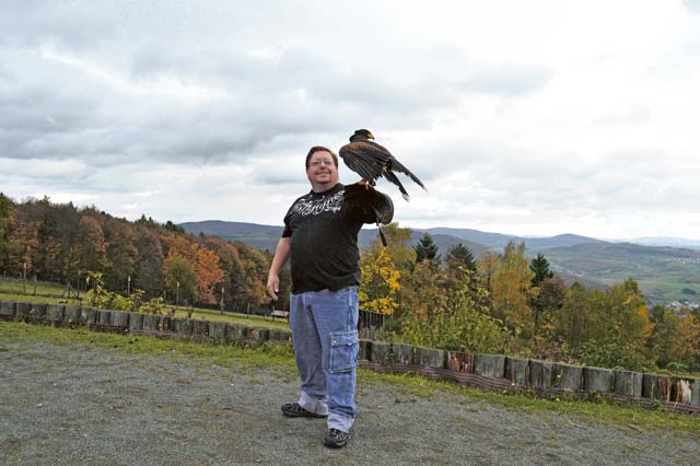 Gary Moore poses for a photo with a Canadian hawk while visiting the Potzberg Wild Animal Park.