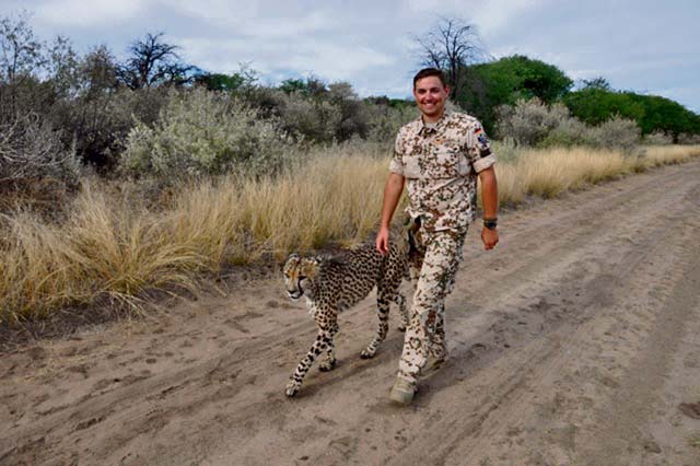 - Photo by Ben Tolkie Joshua Randel takes Antheno the cheetah for a walk at Harnas Wildlife Foundation, Namibia, Nov. 13.