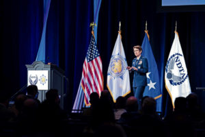 Air Force Gen. Jacqueline D. Van Ovost, commander of U.S. Transportation Command, gives a keynote address at the National Defense Transportation Association Fall Meeting, National Harbour, Md., Oct. 19. Photo by Oz Suguitan