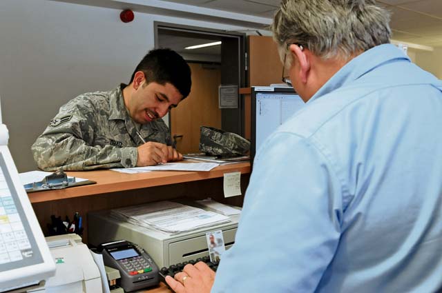 Charles Pittenturf, 86th Force Support Squadron value added tax clerk, helps Airman 1st Class Michael Ortiz, 86th Comptroller Squadron customer service technician, complete a VAT form Aug. 29 on Ramstein. The VAT office provides tax relief opportunities for members and their families stationed in Germany.