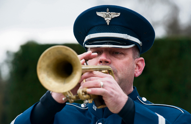 Master Sgt. David Dell, a member of the U.S. Air Forces in Europe Band, plays the trumpet during a Veterans Day event Nov. 11 at the Luxembourg American Military Cemetery in Luxembourg. The event hosted special guests and speakers in an effort to commemorate and honor members of the United States armed forces.