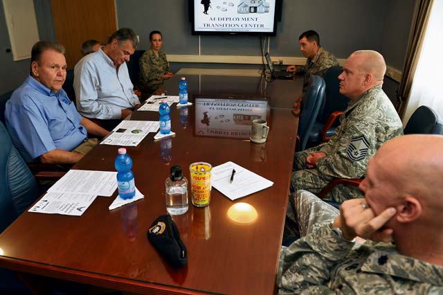 John Biedrzychi, junior vice commander of the Veterans of Foreign Wars (left), and Robert Wallace, Assistant Adjutant General and executive director of the Washington office for the VFW, meet with Senior Master Sgt. David Denton and Lt. Col. Robert Rossi (far right) from the Deployment Transition Center to discuss how the DTC aids redeployers transition back to life at home station Aug. 9 on Ramstein. Members of the VFW also met with Airmen over lunch to share stories. The purpose of the visit was to strengthen the bonds between generations of deployed service members.