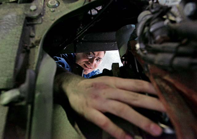 Airman 1st Class Lorne Abshire, 86th Vehicle Readiness Squadron light vehicle mechanic, checks the transmission of a Humvee.