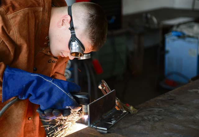 Airman 1st Class Brandon Slagle, 786th Civil Engineer Squadron structural journeyman, welds metal plates together Aug. 6, 2014, on Ramstein. Welding is the joining of two or more metals to repair or build structures by melting two materials together and forming a solid joint. The 786th CES builds and maintains structures and utilities on and off Ramstein.