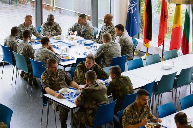 Airmen from different nations dine at the International Dining Facility Aug. 13, 2014, at the Headquarters Allied Air Command on Ramstein. In the past, an escort was required along with several days of processing time to dine at the facility. The change came after a desire to not only offer a new dining facility but also a multinational experience.