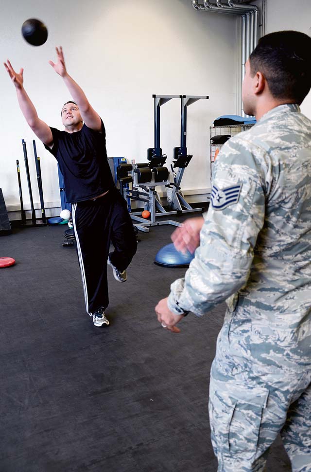 Senior Airman James Harrod, 693rd Intelligence, Surveillance and Reconnaissance Group operations training manager, catches a weighted ball thrown by Staff Sgt. Mario Jimenez, 86th Medical Operations Squadron Physical Therapy technician, during a physical therapy session Aug. 19, 2014, on Ramstein. The 86th MDOS physical therapy clinic can see active-duty patients for a variety of neuromuscular injuries, such as sprains, strains, rehabilitation after the healing of a fracture and more.