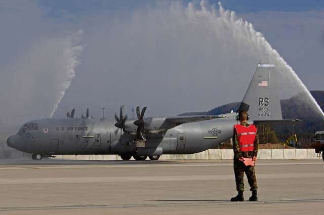 The first U.S. Air Force C-130J to be assigned to the Ramstein Air Base fleet taxies under pressured water from two Ramstein fire trucks during a celebration ceremony April 7, 2009. In August 2014, Ramstein celebrated with the rest of the Air Force as the C-130 hit its 60-year milestone as part of the world’s greatest air force.