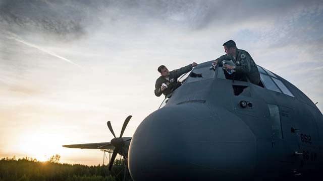 Maj. Jeff Bliss (right) and Capt. Brett Polage, 37th Airlift Squadron pilots, wash the windows of a C-130J Super Hercules May 17, 2014, at Riga International Airport, Latvia, after air-dropping American and Lithuanian service members over Lithuania. Pilots and loadmasters from the 37th AS, alongside an 86th Aircraft Maintenance Squadron flying crew chief, spent four days across three Baltic countries assisting in personnel drops of allied partners and American service members.