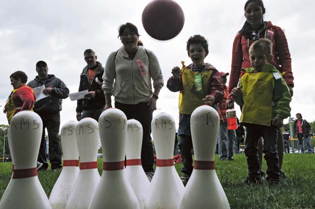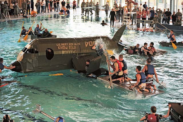 Battle of the Battleships participants go through the challenge round where the last boat left floating wins May 16, 2014, at the Ramstein Aquatic Center.