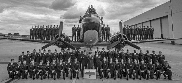 Members of the 37th Airlift Squadron gather for a group photo in front of a Douglas C-47 Skytrain, designated Whiskey 7, May 29, 2014, on Ramstein. The 37th AS recreated the historical photo to mimic a photo taken 70-years ago of the exact same aircraft with members of the 37th Troop Carrier Squadron.