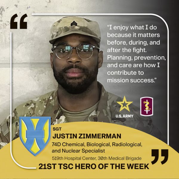 Meet Sgt. Justin Zimmerman, a 74D Chemical, Biological, Radiological, and Nuclear (CBRN) Specialist who serves with the 519th Hospital Center, 30th Medical Brigade.
